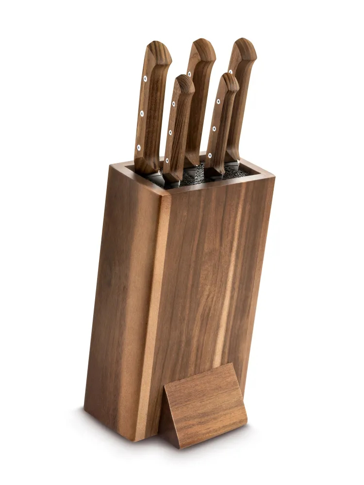 В набор входят нож для чистки, нож универсальный, поварской нож, нож сантоку и нож для хлеба – полный комплект инструментов для ежедневной готовки.Состав набора: Нож для чистки 9 см – компактный и незаменимый на кухне. Подходит для чистки, нарезки и мелкой работы, требующей точности. Длина лезвия (мм): 95, Ширина лезвия (мм): 22, Толщина обуха (мм): 1, Длина рукоятки (мм): 109, Толщина рукоятки (мм): 16, Вес (г): 38Нож универсальный 10,5см – практичный помощник для овощей, фруктов, сыра и небольших кусков мяса или рыбы. Длина лезвия (мм): 105, Ширина лезвия (мм): 21, Толщина обуха (мм): 1, Длина рукоятки (мм): 109, Толщина рукоятки (мм): 15, Вес (г): 40. Нож поварской 16,5 см – главный универсальный инструмент. Широкое и жесткое лезвие подходит для нарезки, шинковки и измельчения любых ингредиентов. Длина лезвия (мм): 165, Ширина лезвия (мм): 34, Толщина обуха (мм): 2, Длина рукоятки (мм): 135, Толщина рукоятки (мм): 19, Вес (г): 86. Нож сантоку 18 см – японский стиль в сочетании с французским качеством. Очень широкое лезвие с воздушными карманами предотвращает прилипание продуктов. Длина лезвия (мм): 180, Ширина лезвия (мм): 41, Толщина обуха (мм): 2, Длина рукоятки (мм): 132, Толщина рукоятки (мм): 21, Вес (г): 104. Нож для хлеба 20 см – создан для хлебобулочных изделий и блюд с хрустящей корочкой. Длинное зубчатое лезвие легко справляется с коркой, сохраняя мякиш целым. Длина лезвия (мм): 200, Ширина лезвия (мм): 41,Толщина обуха (мм): 2, Длина рукоятки (мм): 135, Толщина рукоятки (мм): 20, Вес (г): 100. Подставка - Высота (мм): 260, Ширина (мм): 145, Глубина (мм):125, Вес (г): 1950.Элегантная деревянная подставка для удобного и безопасного хранения. Лезвия из кованой стали X46Cr13 – прочность и долговечная острота. Рукоятки из стабилизированного бука – естественная текстура, удобство и эстетика. Алюминиевые заклепки с антикоррозийной обработкой. Материал: мартенситная нержавеющая сталь с углеродом (X46Cr13).Материал: 54-56 HRC.