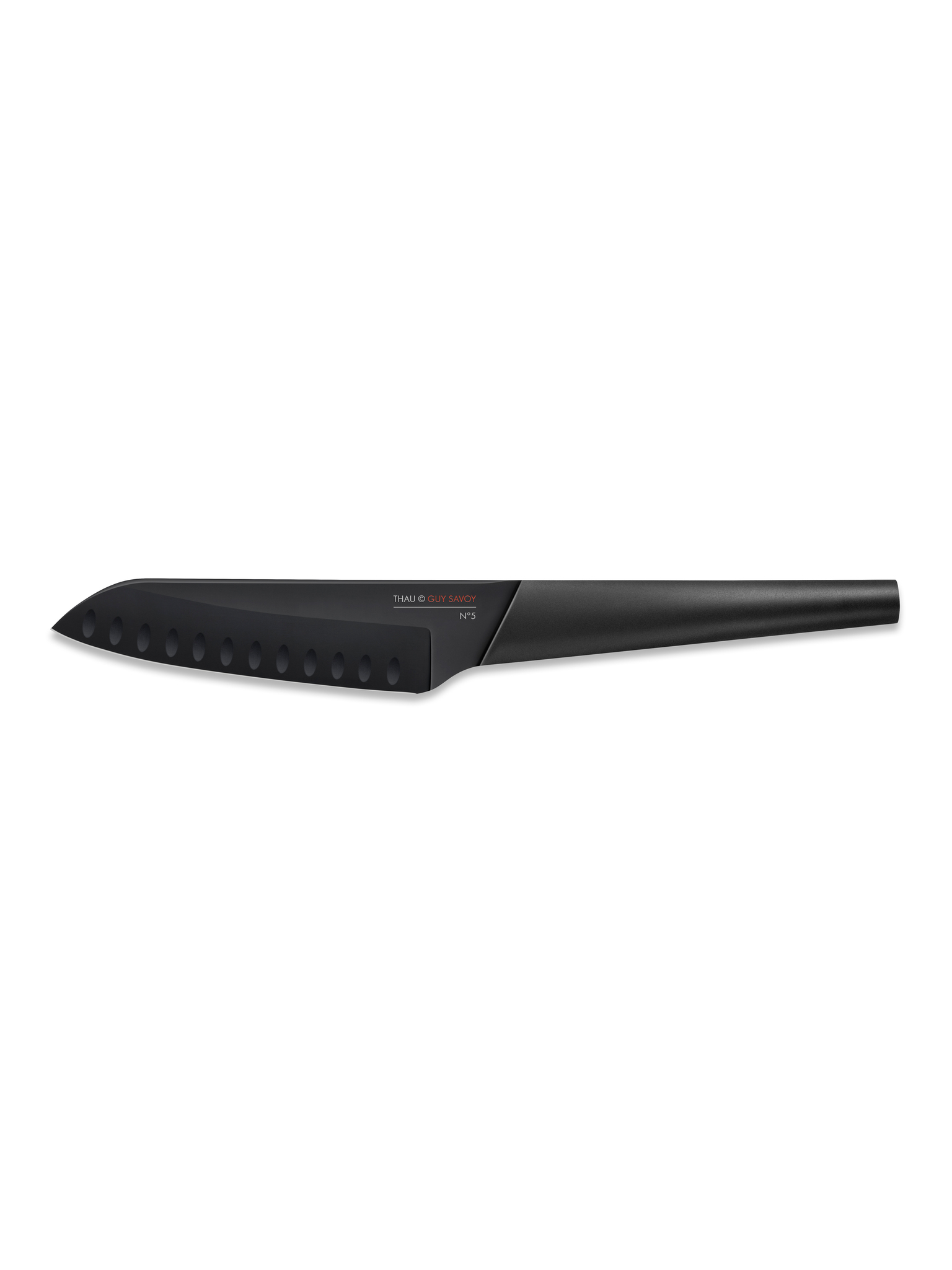 Нож сантоку Thau N°5 Santoku создан шеф-поваром Ги Савуа и дизайнером Бруно Моретти для французской марки Tarrerias-Bonjean. Его форма, как и название, имеет японское происхождение. Очень тонкая кромка позволяет выполнять точную нарезку рыбы и овощей, сохраняя чистый результат и предотвращая появление ржавчины.